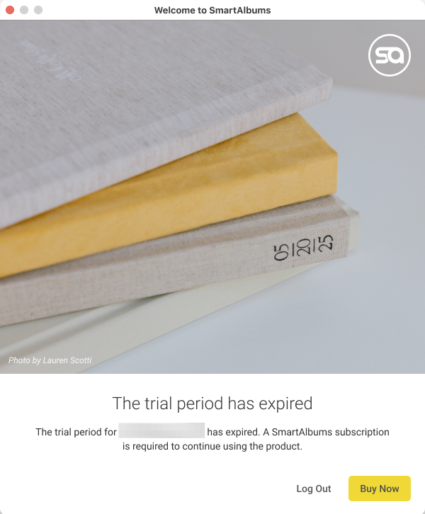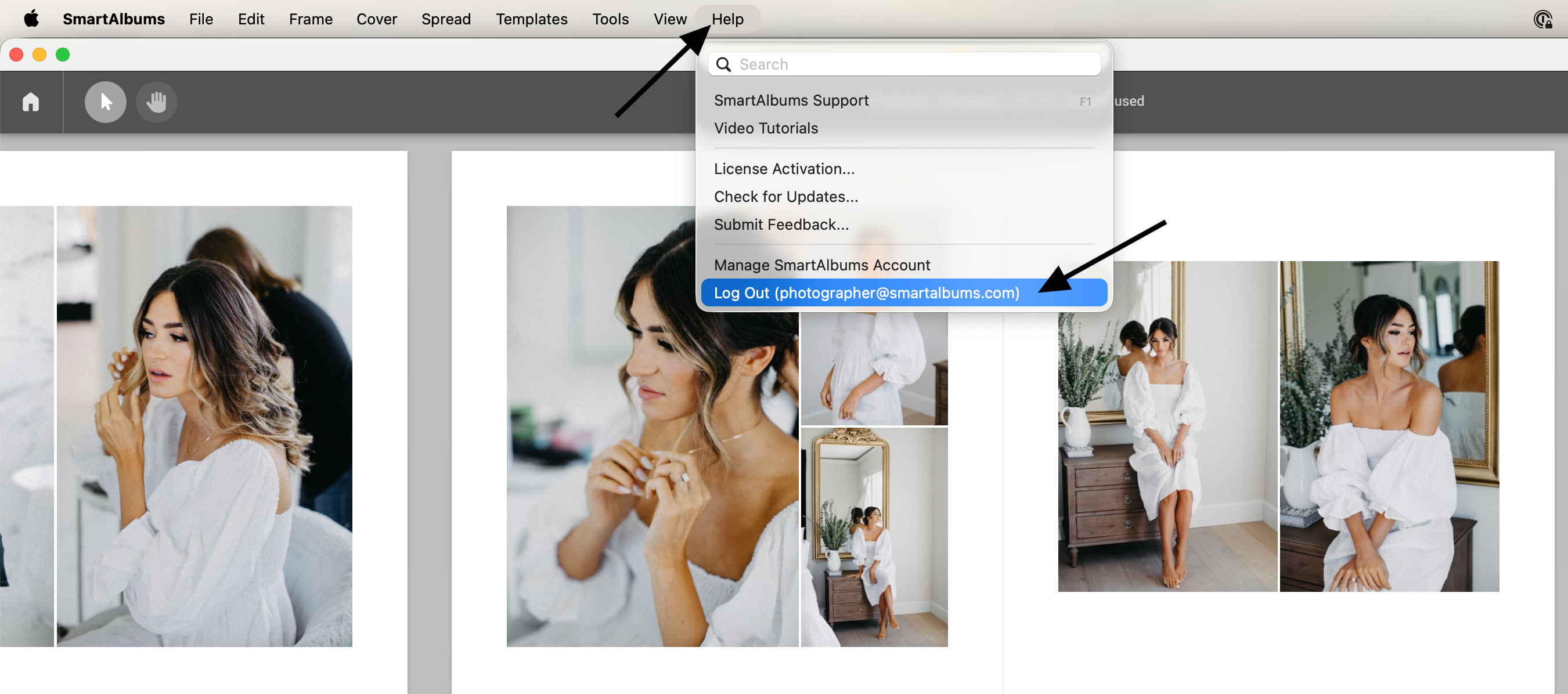 You can log out of SmartAlbums if you want to activate the software with a different email address. To do this, you can click on Help > Log Out.