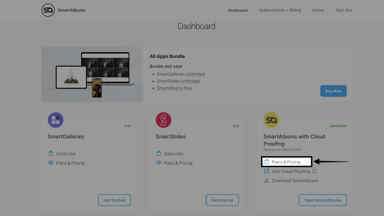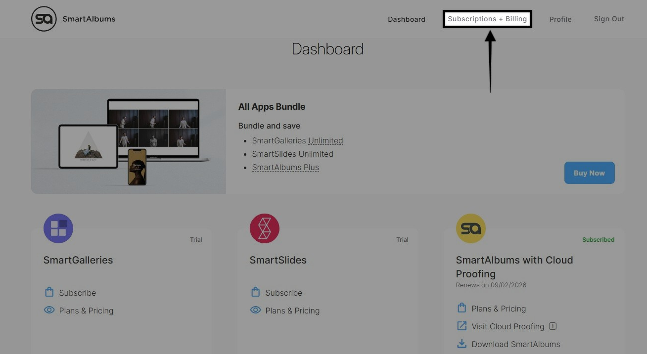 - If you would like to downgrade your All Apps Bundle to a SmartAlbums, SmartSlides, or SmartGalleries plan, you can cancel the current All Apps Bundle within your account, under the Subscriptions + Billing tab (see here).