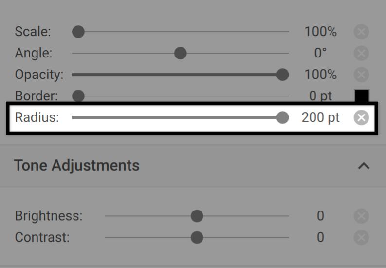 The radius of an image can be applied to a single image or many images at once (if multiple images are selected). Additionally, the image radius can be adjusted in the Designer View or the Main Spread view.