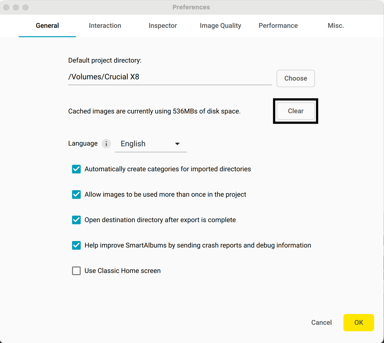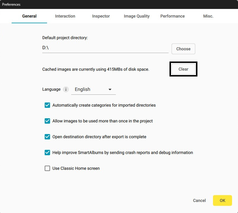 Note: Opening your saved projects for the first time after clearing cache may take longer than usual, as SmartAlbums will need to rebuild image cache for those projects.