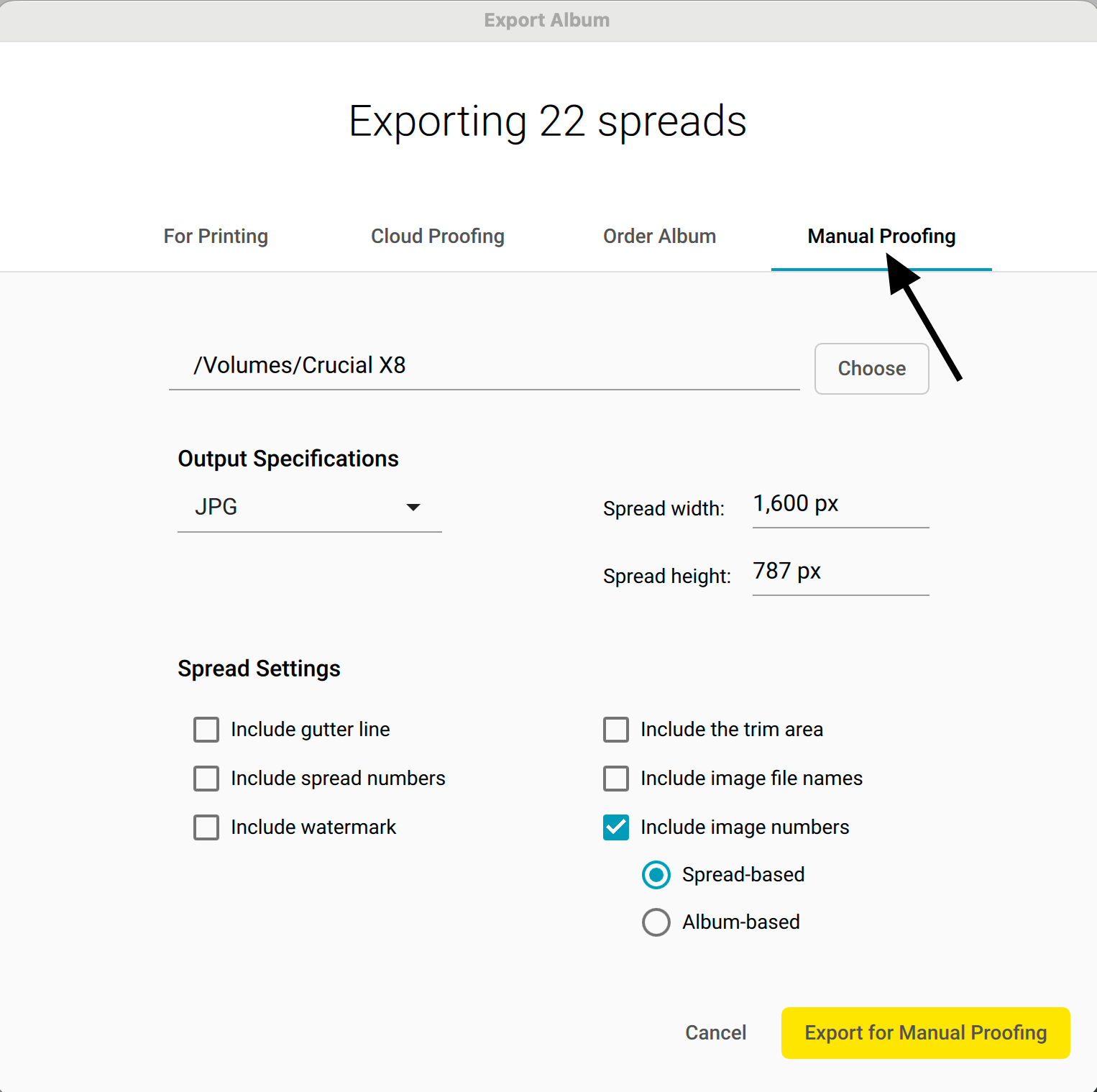 Along with the ability to export your spreads as PDF/JPG files, this export option also includes the ability to add the middle gutter line, image/spread numbers, or a watermark to the spreads as well. If you prefer to export your album using this feature, you can select this option in the Export Album window: